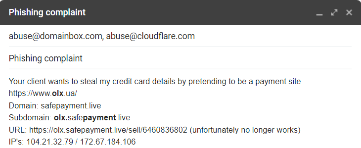 Теперь мы знаем, что у нашего подопытного домен зарегестрирован у domainbox, а проксируется через cloudflare. Нам остается только написать письмо на добытые ящики о недобропорядочности их клиента с предоставлением ссылок и описания (чем больше информации - тем лучше).