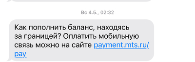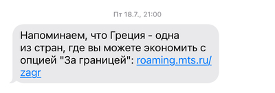 МТС это контора, которой плевать на своих абонентов. Вчера в час ночи получил от них рекламное сообщение - «Напоминаем, что Финляндия — одна из стран, где вы можете сэкономить…» @MTS, у вас все хорошо? Это неуважение к абонентам, к их личному пространству и сну. Это не что то важное, это- реклама. И вы нарушаете закон о рекламе. Бомбануло что жалобу в Роскомнадзор и ФАС отправлю, может научитесь отправлять рекламные СМС в адекватное время.