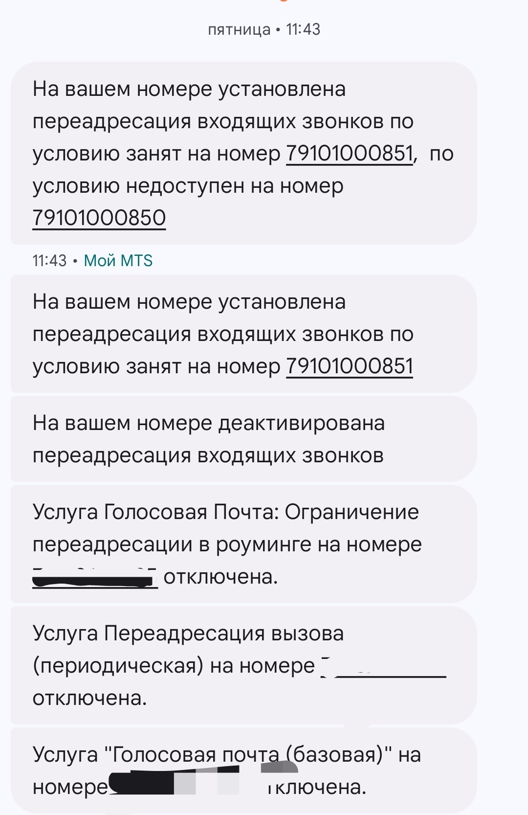 Тоже решил разобраться с этой проблемой, т.к уже дважды отключал переадресацию, а она "магическим" образом подключалась по новой. Дозвонился до оператора, после ругани выяснилось, что все эти функции подключаются автоматически, если подключена опция "голосовая почта" (та, которая разрешает оставлять сообщения, если не дозвонился до человека). После отключения посыпались такие сообщения, в одном из них есть "периодическая переадресация", фиг знает что она вообще значит. Посмотрим что будет дальше