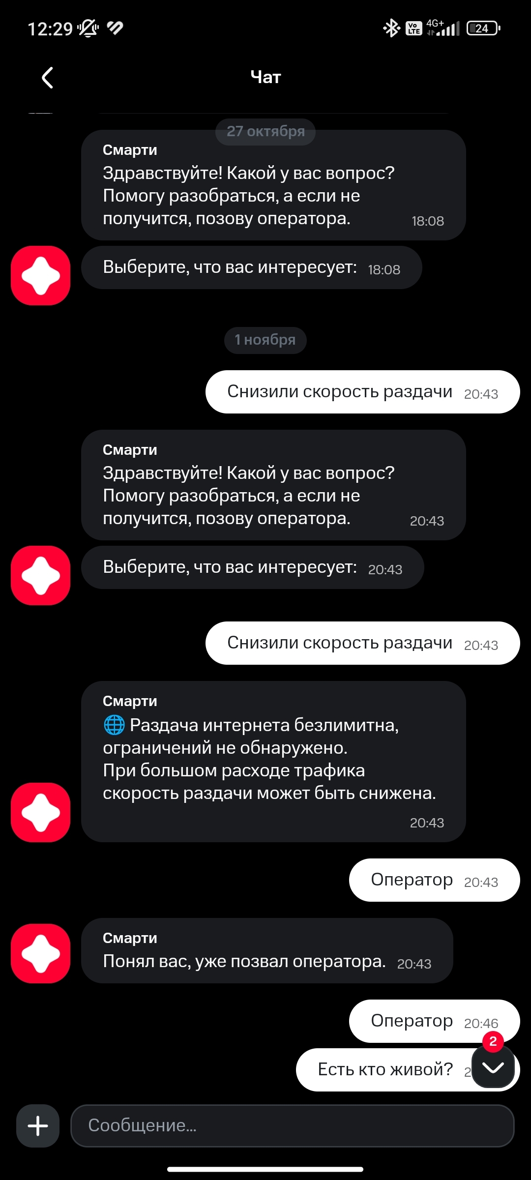 Заехал 24 октября, 27 октября во время просмотра хоккейного матча с участием моей любимой команды приходит смс с оповещением и снижении скорости до 256 кбит. Я просто охуел. Нет, я ОХУЕЛ. Решил, что изъебу им все мозги во время перерыва между периодами. Немного подергавшись, первый оператор ушел в закат. На смену ему пришел другой. Поняв, что я настроен очень категорично, оператор Ольга, цитирую, "обновила квоту раздачи". Возможно, я неправильно ее понял. Но в моем понимании мне просто дали 30 гб сверху.