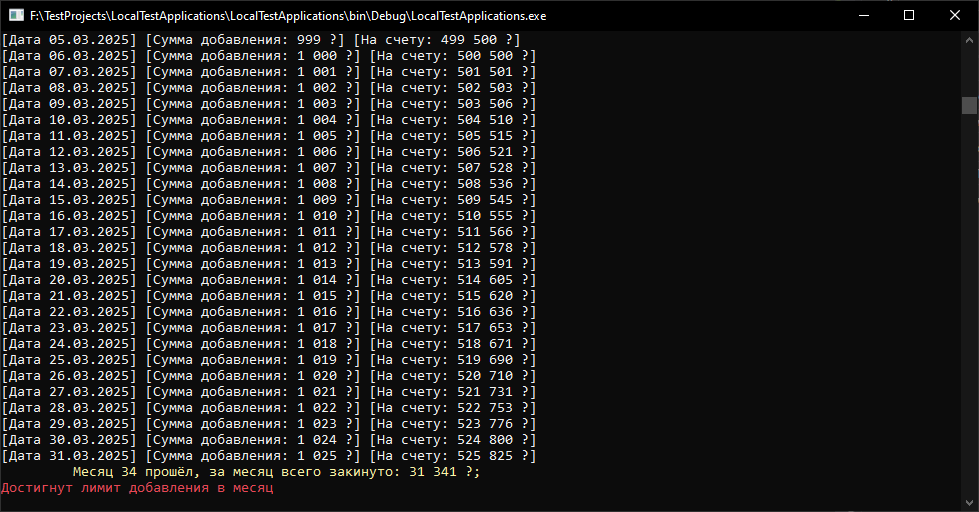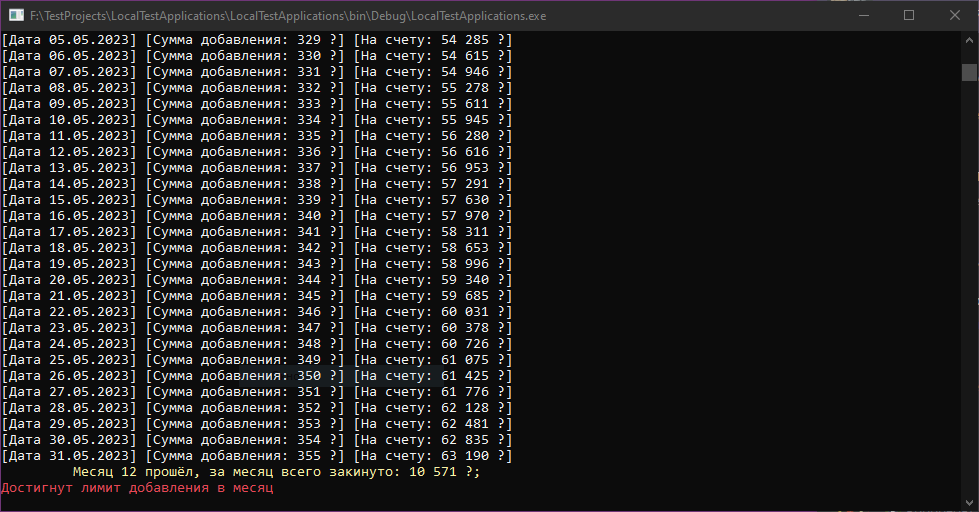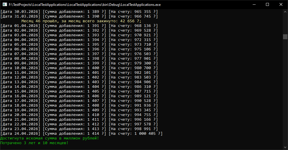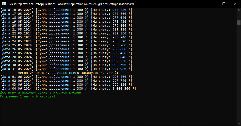 Наткнулся на пост, стало интересно посчитать, что же там по итогу выходит реально с таким способом накоплений (да, мне очень скучно). Набросал простую программку, посмотрел, поправил ошибки и несколько допилил вывод. По итогу, метод накопления забавный, но его эффективность спорная =). В первой версии проверочной утилиты, я задал лимит в виде суммы добавления, но потом добавил вывод информации по месяцам (т.к. очевидно, что больше определённой суммы положить в месяц не выйдет), и ограничение расчёта сделал именно по лимиту добавлений за месяц. Ну и добавил всяких красивостей (ниже там будет на скриншотах знак вопроса вместо значка валюты - что-то не так с выводом в консоль символа рубля из стандартного форматирования, мне уже было лень это править).