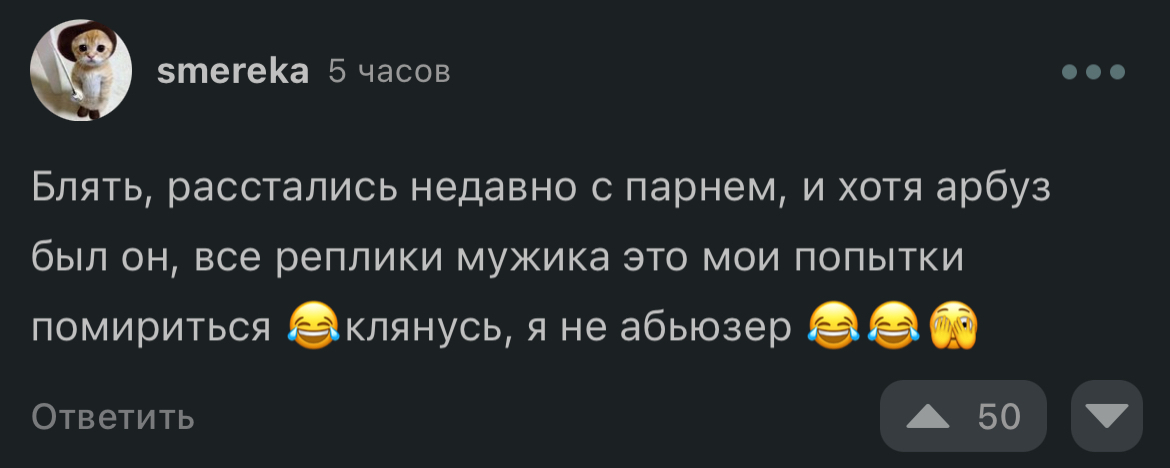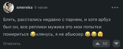 В том и прикол истинного абьюза - найти жертву, которая норм жила, норм выглядела, норм чувствовала себя. И высосать из нее всю радость и уверенность в себе. Когда тебе изо дня в день, порой очевидно, порой не очень, давят самооценку, невольно начинаешь сомневаться в себе и своей адекватности. И самое смешное, что я видела это, понимала, но не хотела ничего менять. Бабы - они такие 😂