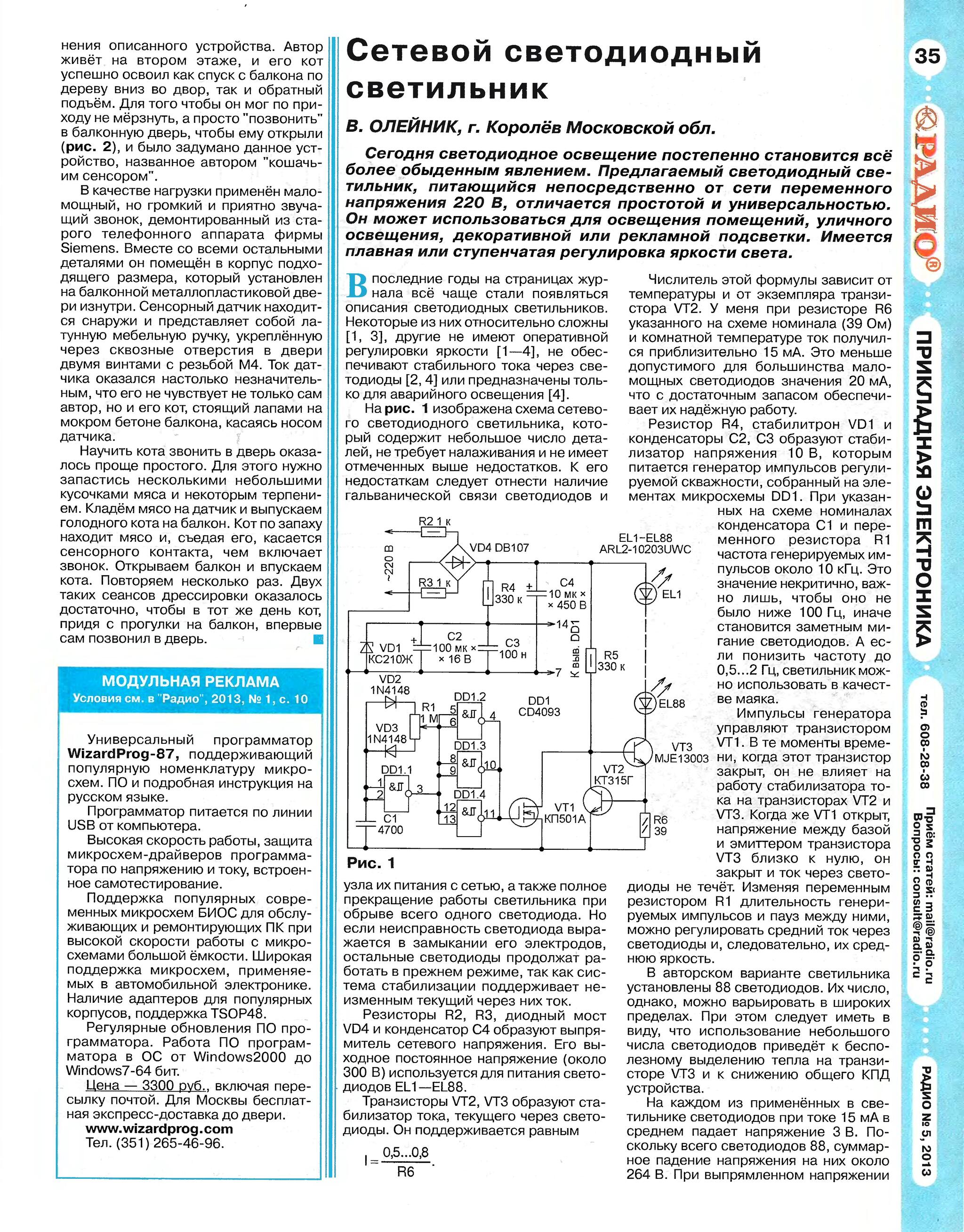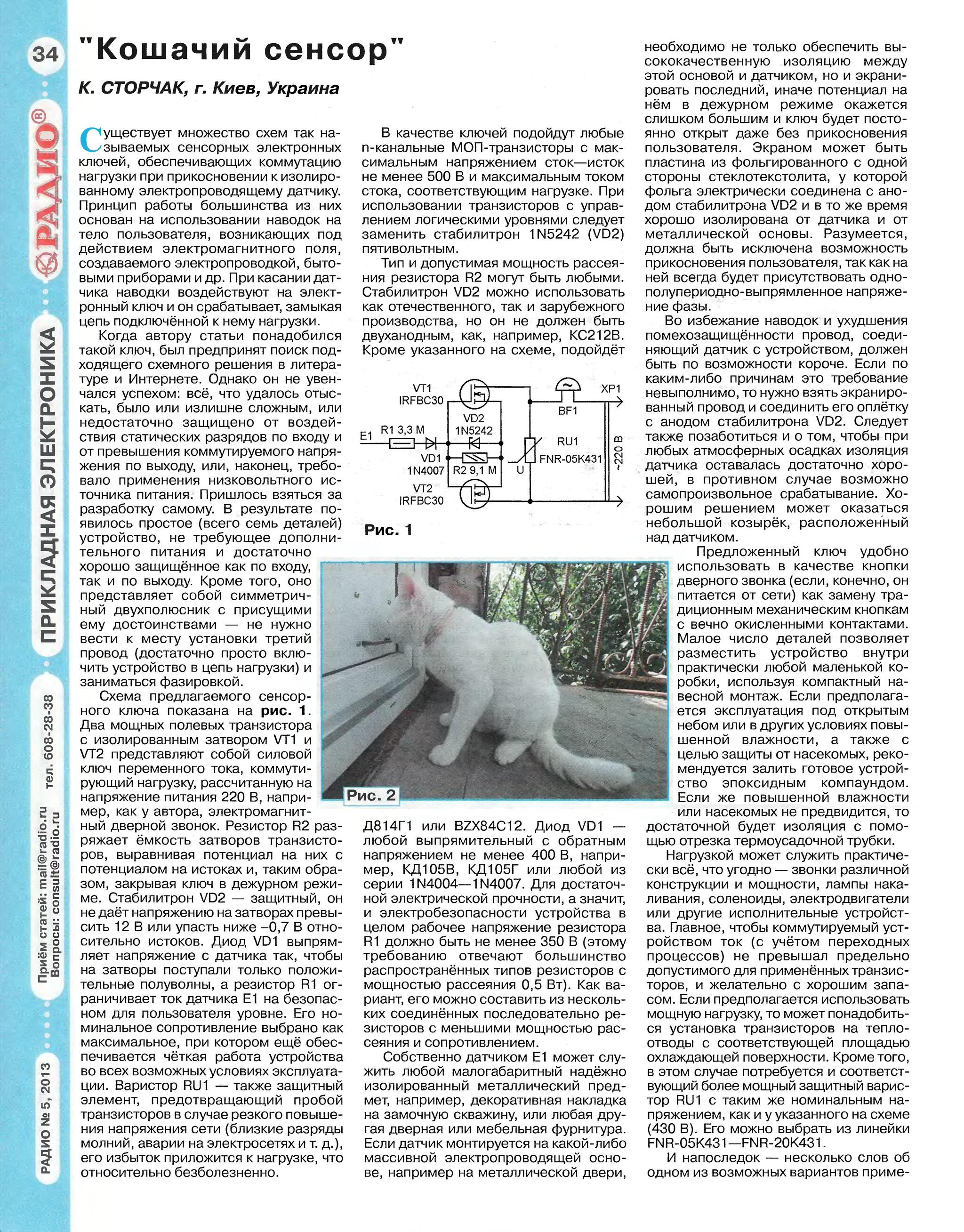 Про звонок есть статья в журнале "Радио" за Май 2013. Для тех, кто не очень понимает технический язык (типа меня) аннотация к статье кратко и просто всё передаёт : "Автор живёт на втором этаже, и его кот успешно освоил как спуск с балкона по дереву вниз во двор, так и обратный подъём. Для того чтобы он мог по приходу не мёрзнуть, а просто «позвонить» в балконную дверь, чтобы ему открыли, и было задумано данное устройство. Оно содержит всего семь деталей и представляет собой силовой ключ переменного тока на двух мощных полевых транзисторах с изолированным затвором IRFBC30, нагруженный на громкий и приятно звучащий звонок, демонтированный из старого телефонного аппарата. Вместе со всеми остальными деталями он помещён в корпус подходящего размера, который установлен на балконной металлопластиковой двери изнутри. Сенсорный датчик находится снаружи и представляет собой латунную мебельную ручку. Ток датчика оказался настолько незначительным, что его не чувствует не только сам автор, но и его кот, стоящий лапами на мокром бетоне балкона, касаясь носом датчика. Научить кота звонить в дверь оказалось проще простого. Двух сеансов дрессировки оказалось достаточно, чтобы в тот же день кот, придя с прогулки на балкон, впервые сам позвонил в дверь…"