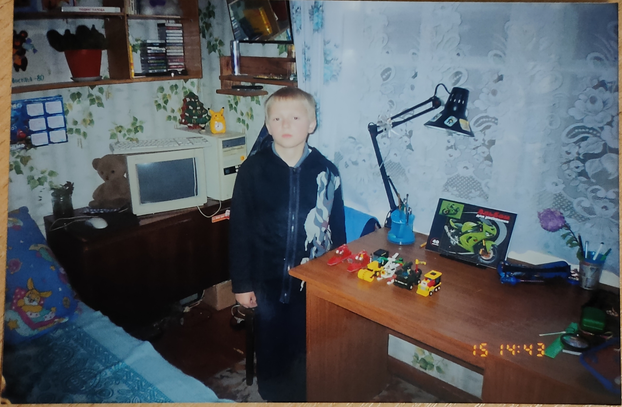 Потом комп проапгрейдили до Pentium 133 мегагерц, 32 мб оперативки и 850мб HDD. На фото мы и наблюдаем малого меня рядом с ним. В отражении в зеркале видно желтую упаковку дискет 5.25. Год 2004.
