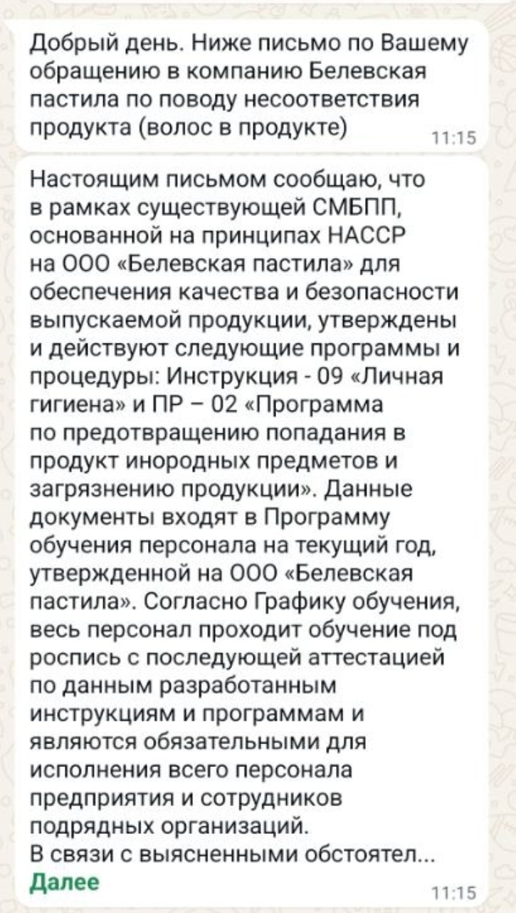 А вот я теперь никогда не буду покупать эту пастилу и другим не советую. Потому что летом обнаружила внутри пачки сюрприз в виде чёрного волоса и полное нежелание производителя пояснить необходимые действия в данной ситуации. После третьего запроса с моей стороны (спрашивала как поступить мне и куда вернуть испорченное) мне неохотно рассказали, что проведут беседу с работниками, но на этом всё. Разумеется, как бы ни любила её раньше, теперь есть это я уже никогда не смогу. А видя отношение и штампованные обещания понимаю, что ничего они менять на производстве не станут. И боюсь даже представить, что ещё, менее заметное или глубже замешанное может оказаться в этой пастиле.
