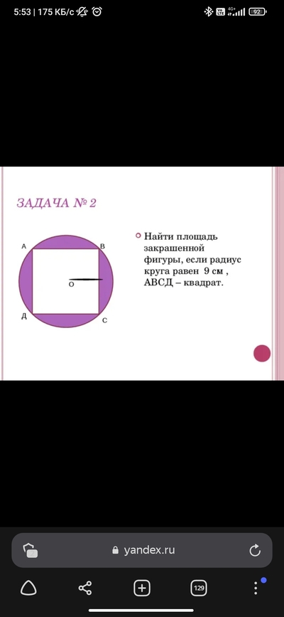 Площадь закрашенной фигуры 254,34-162=92,34 см²
