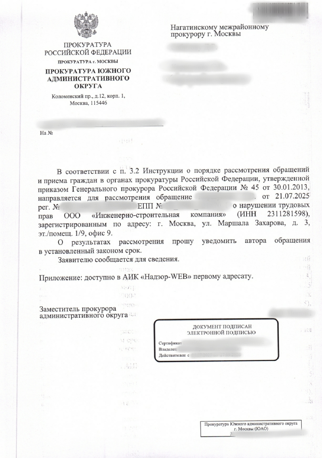 И так спустя месяц мне звонит сотрудник Нагатинской прокуратуры, спрашивая получил ли я расчет, на что конечно же никаких выплат не было.