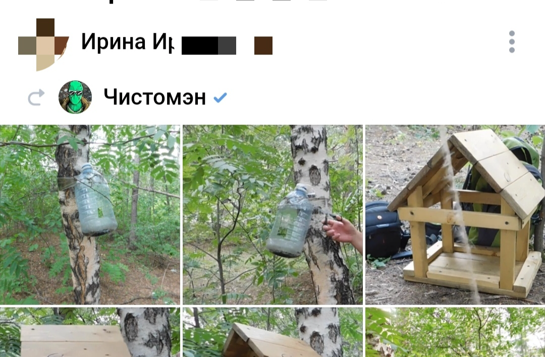 А я познакомилась с проектом Чистомена в 2019 году. Как раз год моего переезда из Москвы в провинцию и удивление от того, что кормушки для птиц тут были сделаны из пластиковых бутылок. Я тогда занималась волонтерством с птицами и знала, что бутылки очень опасны, потому что птицы в них могут застрять. По нашим птичьим пабликам ходила фотка застрявшей в бутылке сойки. Птица не смогла выбраться и погибла.