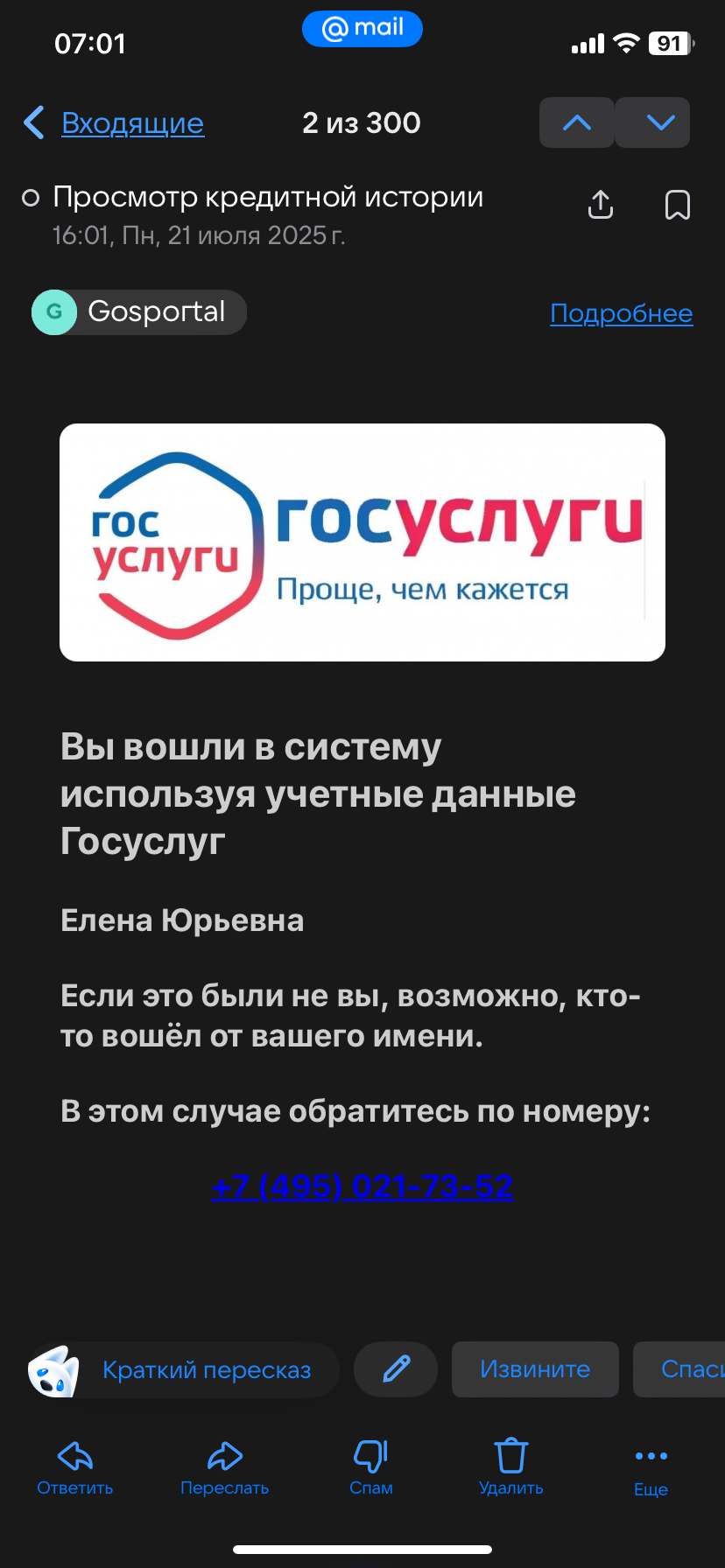 6 Kudryun Ответ на пост «Новая схема?»5 5 месяцев назад Тоже пришло на почту сообщение, только от отправителя «Gosportal», и, честно признаться - сначала письмо вызвало волнение и первые секунды была мысль позвонить по указанному в письме номеру. Будьте аккуратнее, схема набирает оборот. [моё] Мошенничество Интернет-мошенники Госуслуги Негатив Скриншот Ответ на пост Длиннопост Волна постов Ещё 0