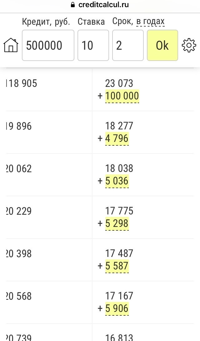 Внесем досрочно 100 000 сначала с уменьшением срока кредита