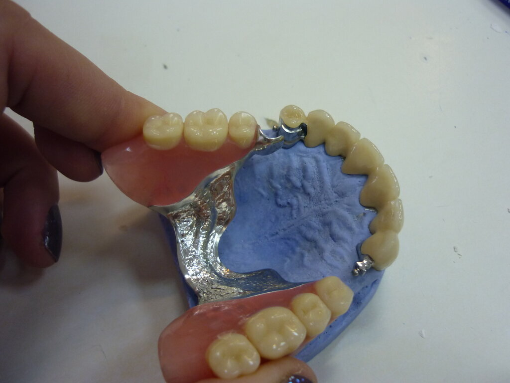 А) Балочная конструкция + съемный бюгельный протез. К 4-6 имплантатам прикручивается фрезерованная балка, которая остается постоянно. На нее одевается съемный бюгельный протез с ответной частью в самом протезе. Достаточно комфортный вид, минимальный размер. Материалы съемного протеза, акрил тот же.