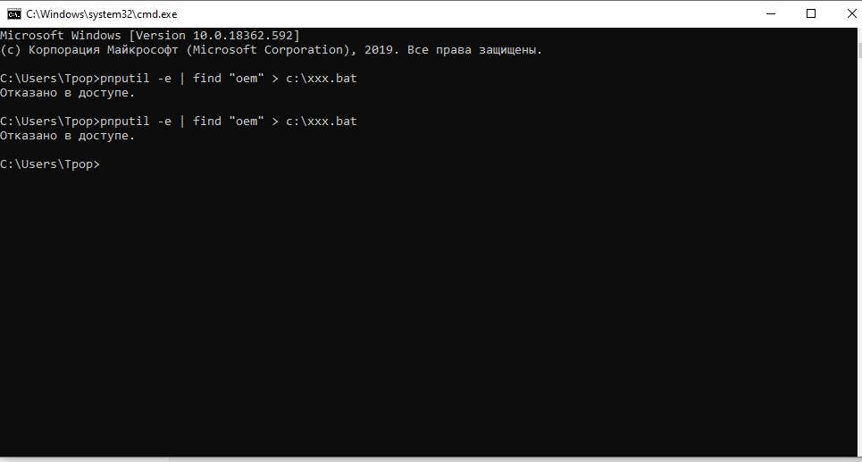 2. В появившемся черном окне набираешь pnputil -e | find "oem" > c:\xxx.bat