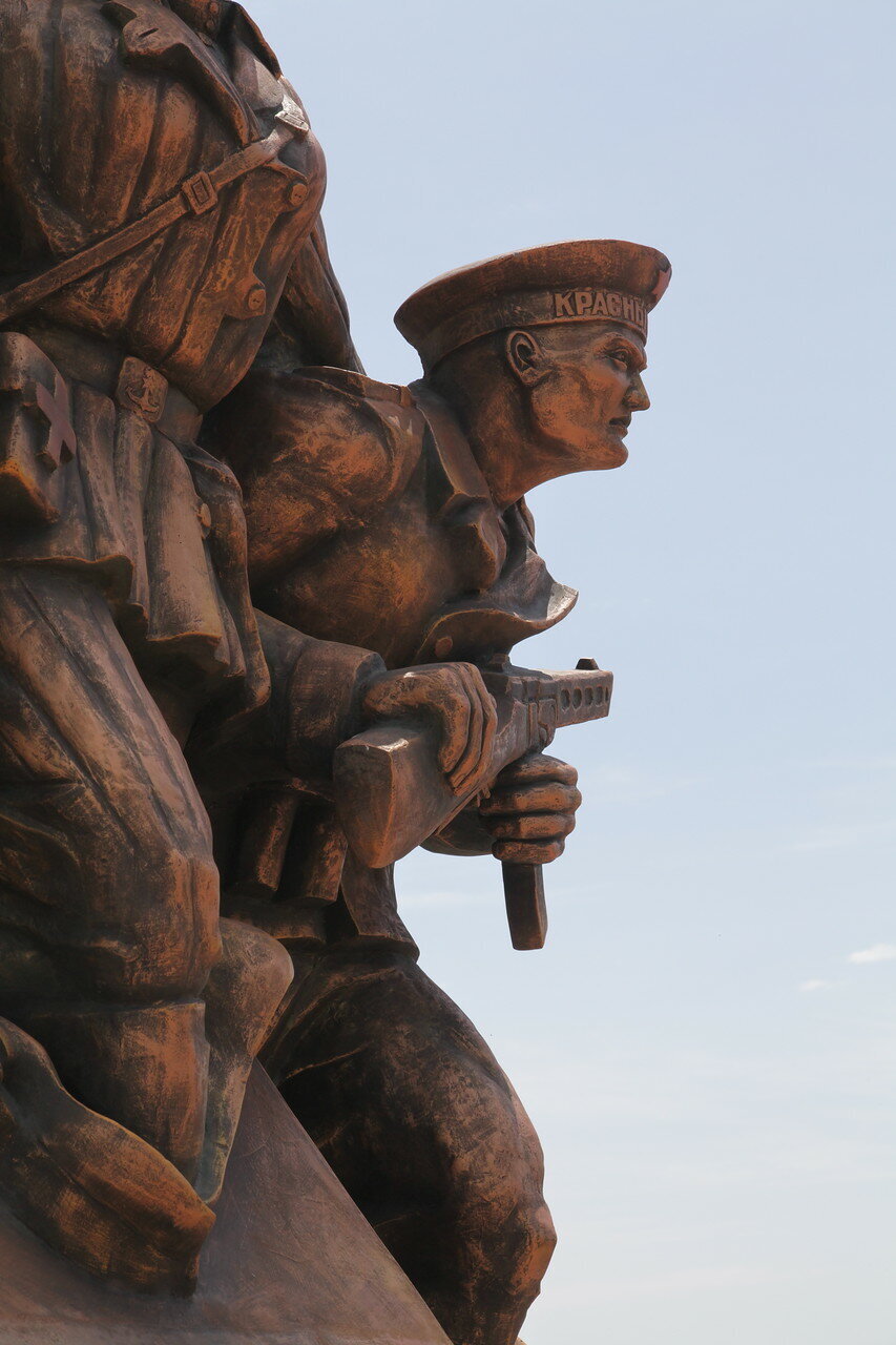 Это бетонное позорище, покрашенное бронзянкой должно напоминать зрителю о страшных героических событиях высадки Керченского десанта.