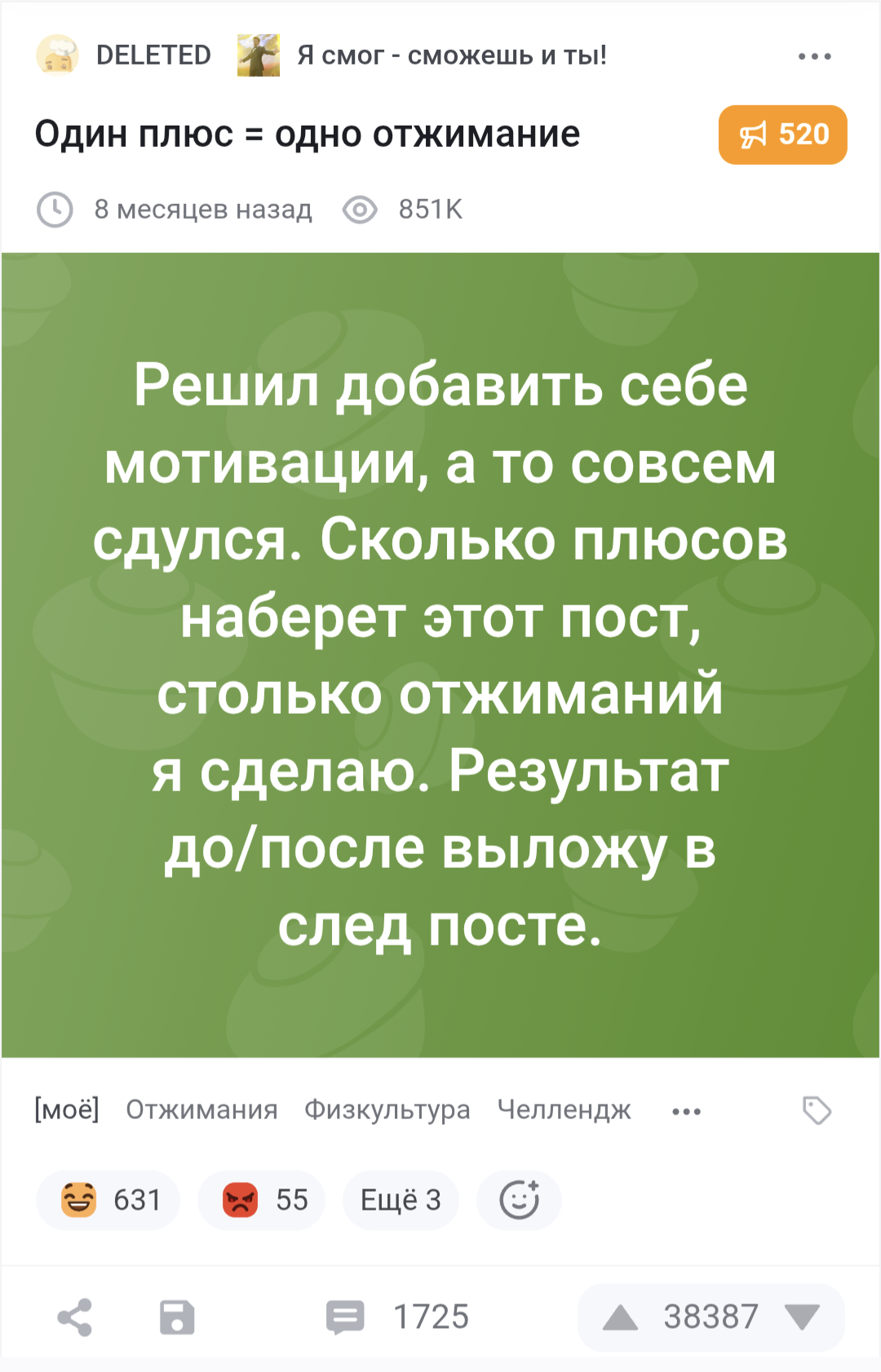 14 Tantacula Введите текст Я смог - сможешь и ты! Ответ на пост «Один плюс = одно отжимание»521 5 месяцев назад Кто-то помнит, этот физкультурник доотжимался перед тем, как удалиться? Отжимания Физкультура Челлендж Текст Короткопост Без рейтинга Волна постов Ответ на пост Посты на Пикабу Скриншот Вопрос Спроси Пикабу 4 1 1 Ещё 0