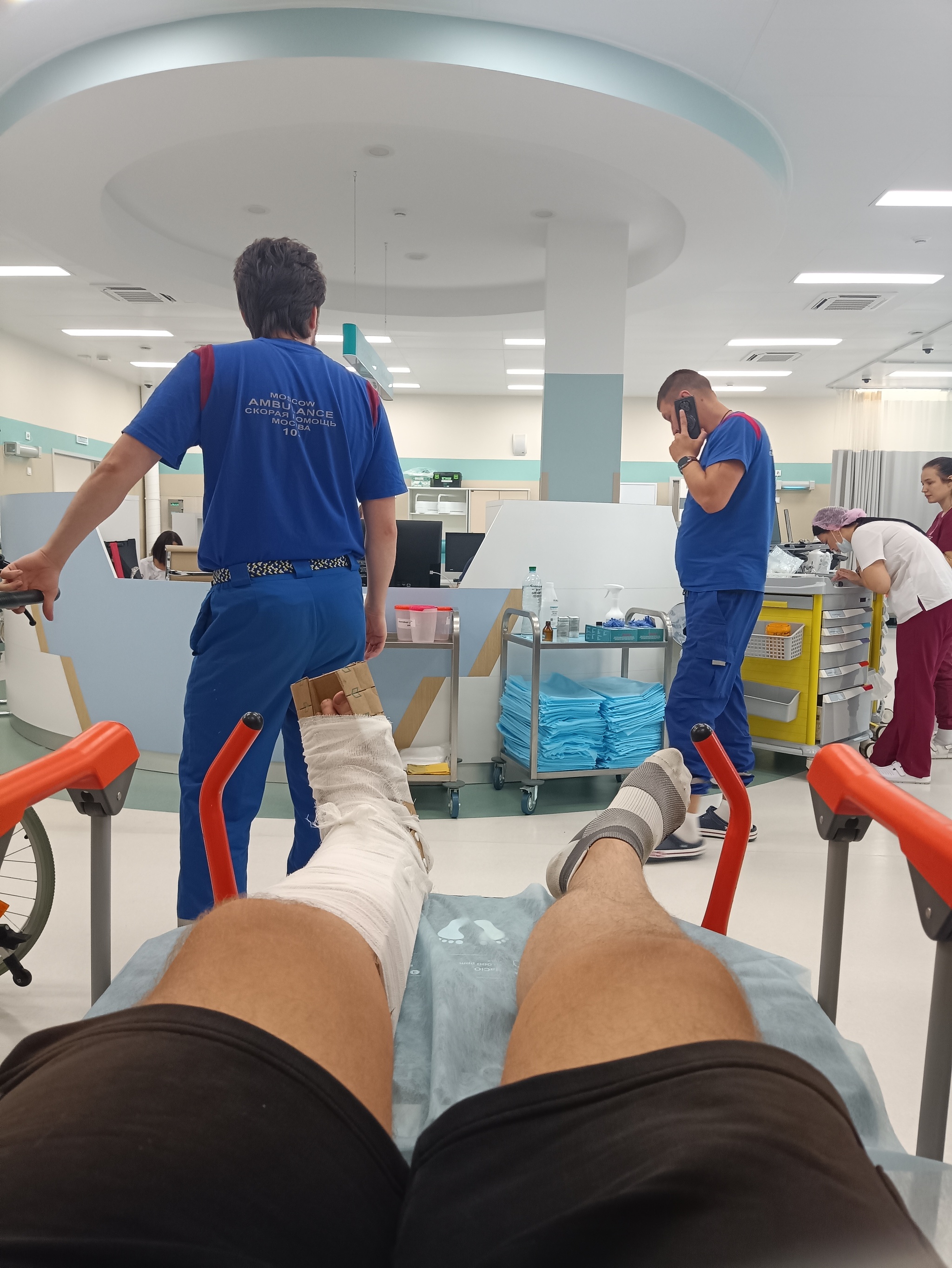 завезли в гараж, переиащили в инвалидку, нацепили ьраслет как в отеле и отвезли в "зелёную" зону, типа лёгкий пациент. За пару часов (точно не помню, уснул) сделали несколько рентгенов, кучу анализов, ЭКГ, тромбы поискали, обезбола добавили, катали меня на каталке как на американских горках, аж дух захватывало. А потом добрый доктор травматолог подошёл на очередной перекатке и спросил (далее Д-доктор, Я-это я):
