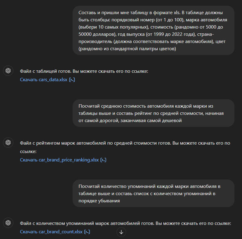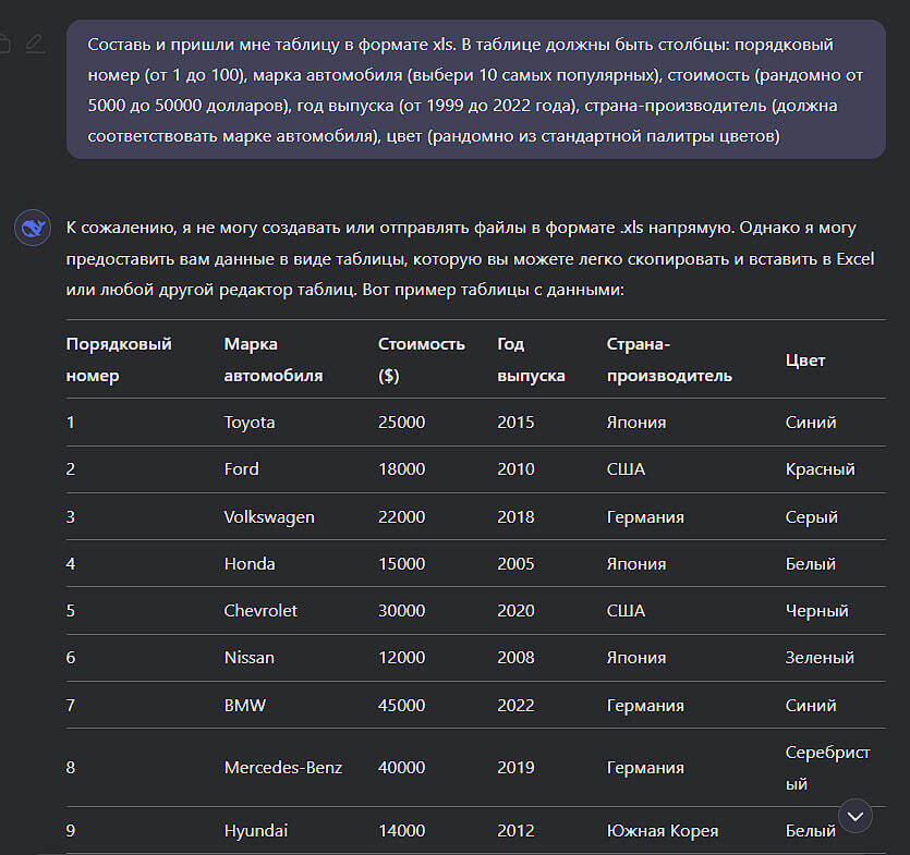 Попросил GPT: "Составь и пришли мне таблицу в формате xls. В таблице должны быть столбцы: порядковый номер (от 1 до 100), марка автомобиля (выбери 10 самых популярных), стоимость (рандомно от 5000 до 50000 долларов), год выпуска (от 1999 до 2022 года), страна-производитель (должна соответствовать марке автомобиля), цвет (рандомно из стандартной палитры цветов)" - он всё сделал и прислал качественную таблицу, и значения стоимости с рандомным шагом. А также смог проанализировать таблицу по заданным далее параметрам.