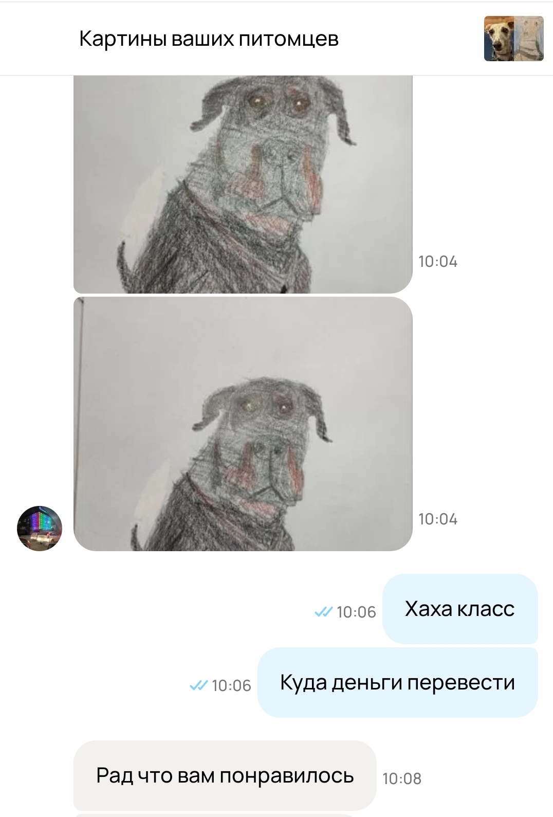 41 VANDAL529 Ответ на пост «Отец года»5 6 месяцев назад Так же в конце февраля наткнулся на интересное объявление ( сейчас правда неактивно). Прочитал, посмотрел рисунки - прикольно, думаю почему бы нет и кидаю фото своего пёселя. На следующий день вечером как и обещал прислал рисунок. [моё] Юмор Авито Скриншот Объявление Позитив Волна постов Ответ на пост Длиннопост 1 1 Ещё 0