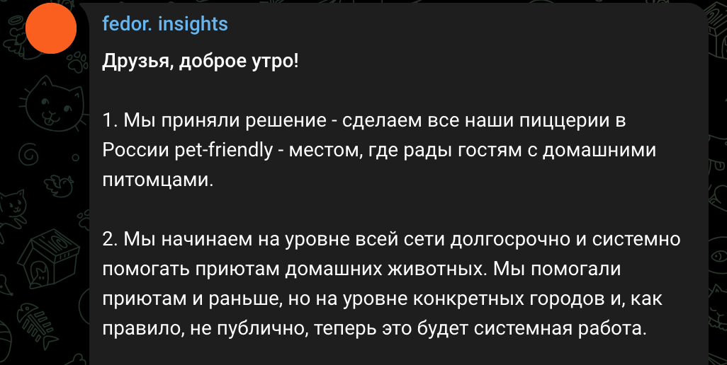 Не прогибайтесь под зоошизу, иначе завтра под дверью каждой пиццерии будет привязано по три псины, на питание которых, с вас будут требовать деньги!