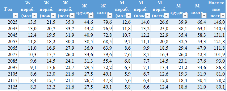 В первой таблице приведен прогноз(составлен ИИ) численности населения России с учетом разных категорий (трудоспособности, пола, возраста) данные из которого будут использоваться для дальнейшего анализа. Здесь отчетливо видно что численность населения будет падать нисмотря ни на что. Картина печальная, но такова правда.