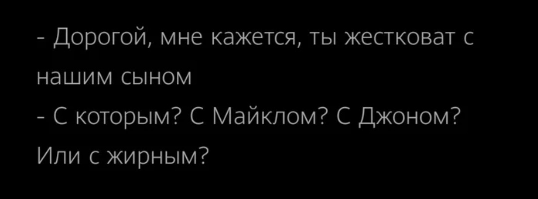 5804 MihallCH Ответ на пост «Paint it black»1 4 года назад Это же анекдот про Шварца и сыновей: Картинка с текстом Категория б Арнольд Шварценеггер Сын Ожирение Ответ на пост Джозеф Боэна 52 11 5 3 3 Ещё 0