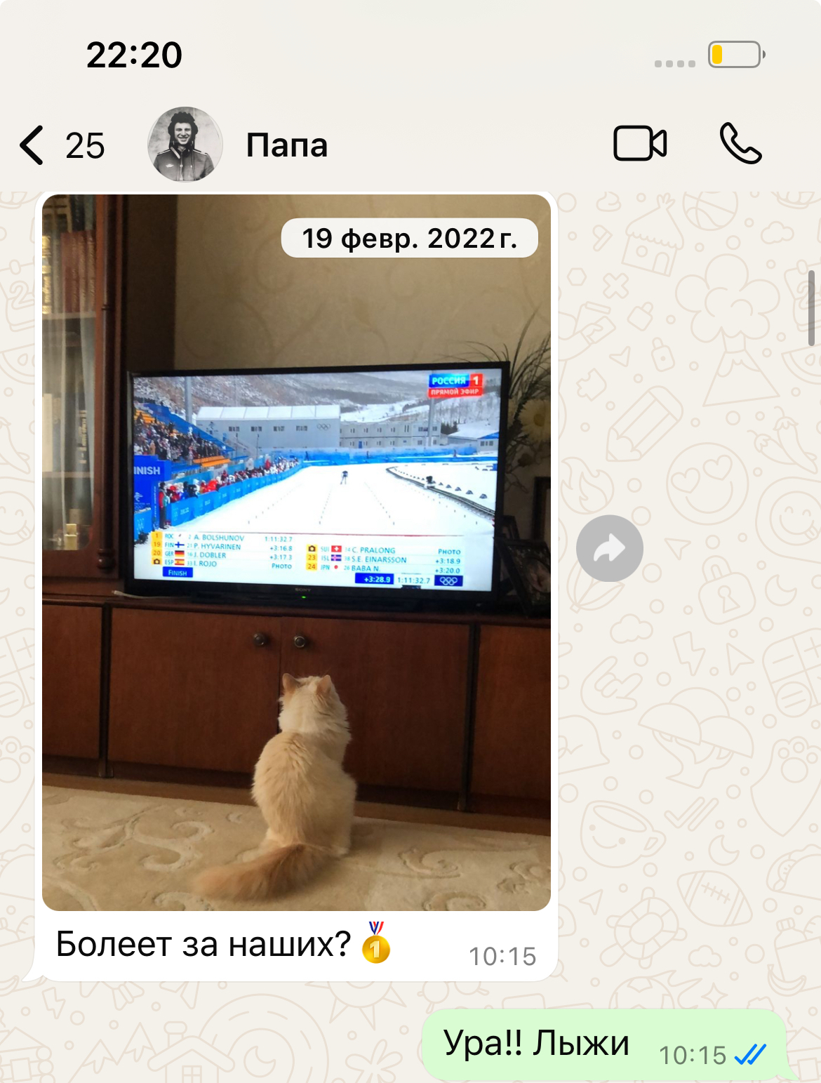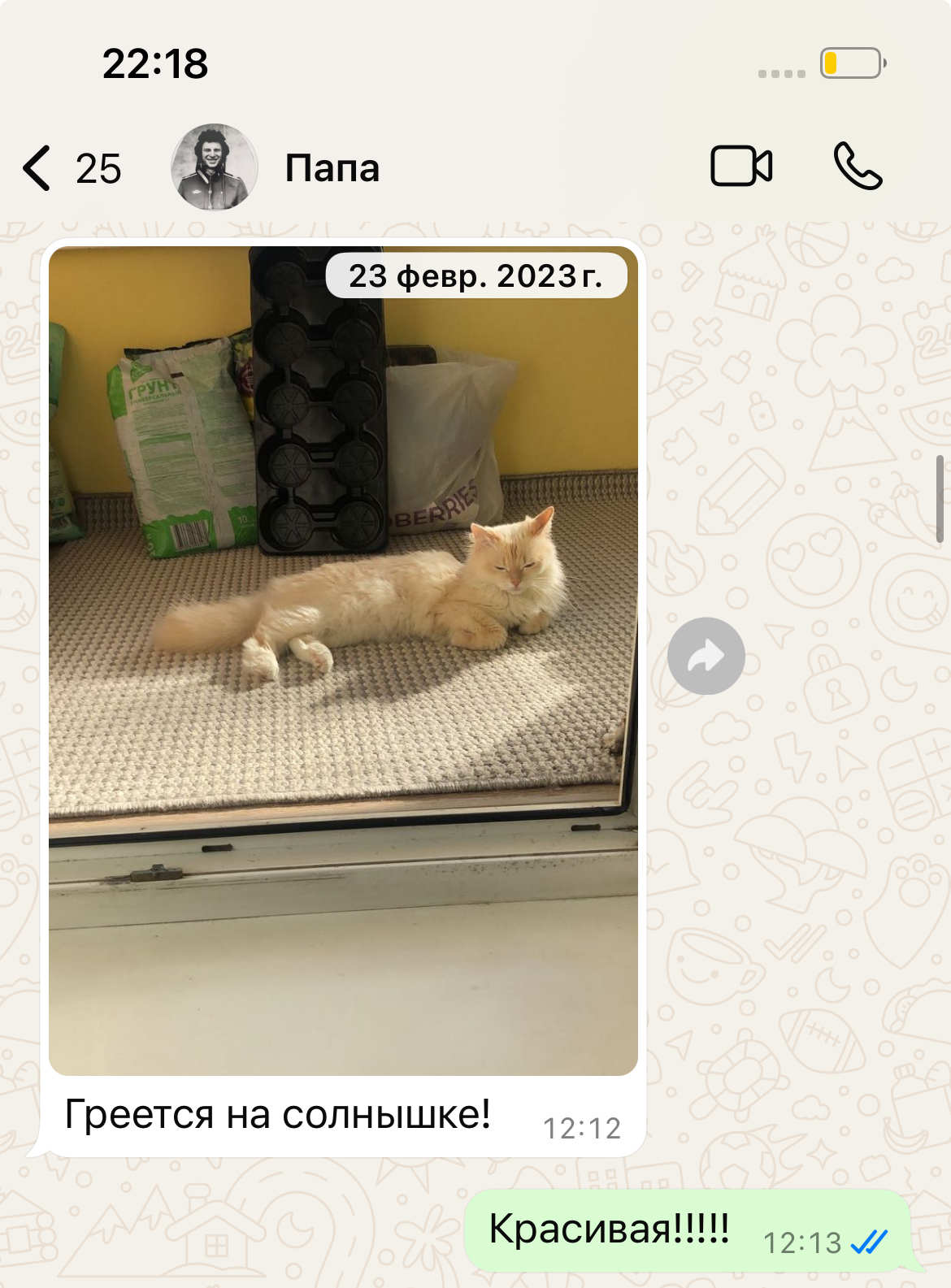 Спасибо всем, что так неожиданно тепло отреагировали на мой пост, где я выложила скрины папиных сообщений про мою кошку Соню. После этого я вспомнила, что раньше мы с папой чаще общались в вотсап) я зашла туда и поняла, что там просто кладезь его любовно-смешных сообщений про кошку. Это еще не всё) выложу еще пост😁