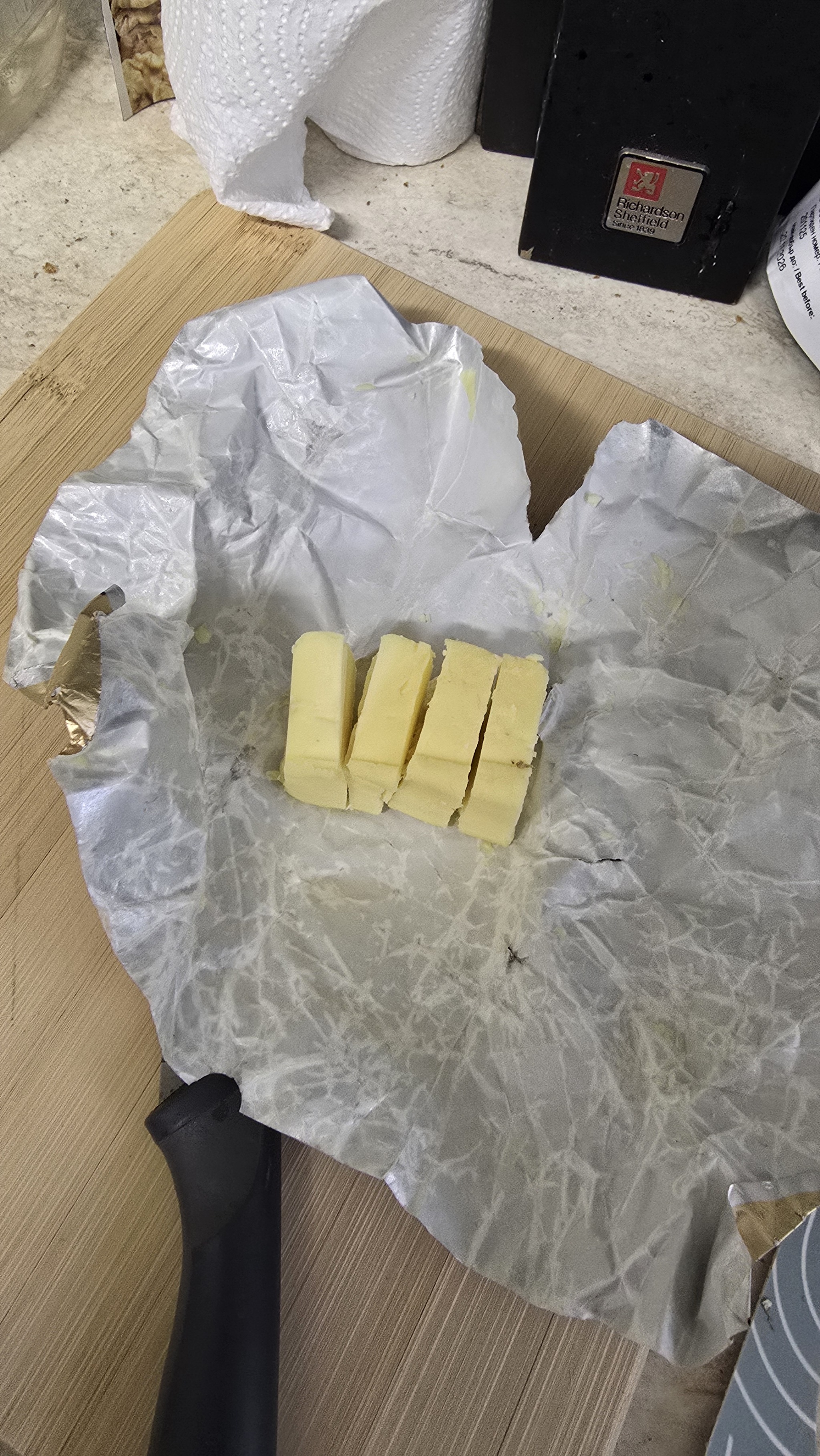 Аналогично делаем с маслом - покупаешь 100 гр - и сразу режешь на глаз на 10 кусков, по 10гр на буханку. (тут уже полпачки осталось)