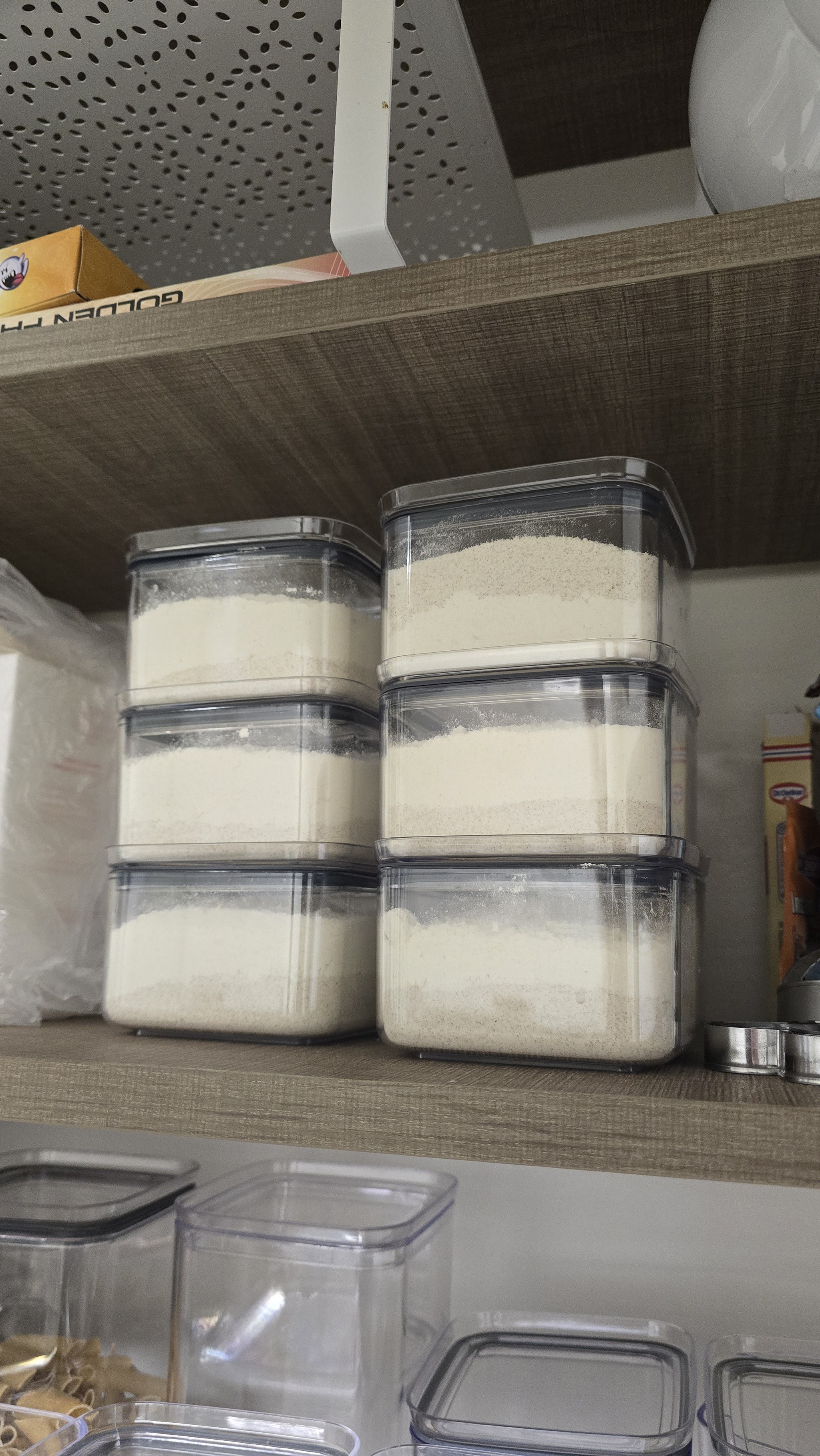Делаю небольшие буханки, 200гр муки, 50/50 белая и цельнозерновая мука. Официально - по инструкции - так не должно получаться - "не поднимется, не размешается" и т.п. По факту - всё работает, с утра у тебя прекрасная небольшая свежая, офигенно вкусная буханка, которую я спокойно за 2 дня максимум могу съесть. Но я же ещё ленивый... Это каждый раз нужно достать пачку муки, отмерить граммы, достать вторую, соль, сахара... Поэтому куплены контейнеры 500мл, покупаем кило такой муки, кило другой, берём сахар и соль - и развешиваем сколько получается по контейнерам. Получается такая аккуратная полочка с заготовками: