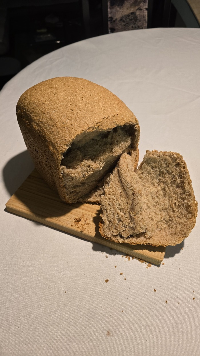 Мне она почему-то приехала с инструкцией только на испанском. No hablo espanol, поэтому качаем с интернета. Берём цельнозерновую муку, масло, сахар, соль, дрожжи, засыпаем, тыкаем согласно инструкции, ставим на ночь. С утра просыпаемся от запаха свежего хлеба! Пахнет умопомрачительно. Всё достаём, пробуем. Вкусно.
