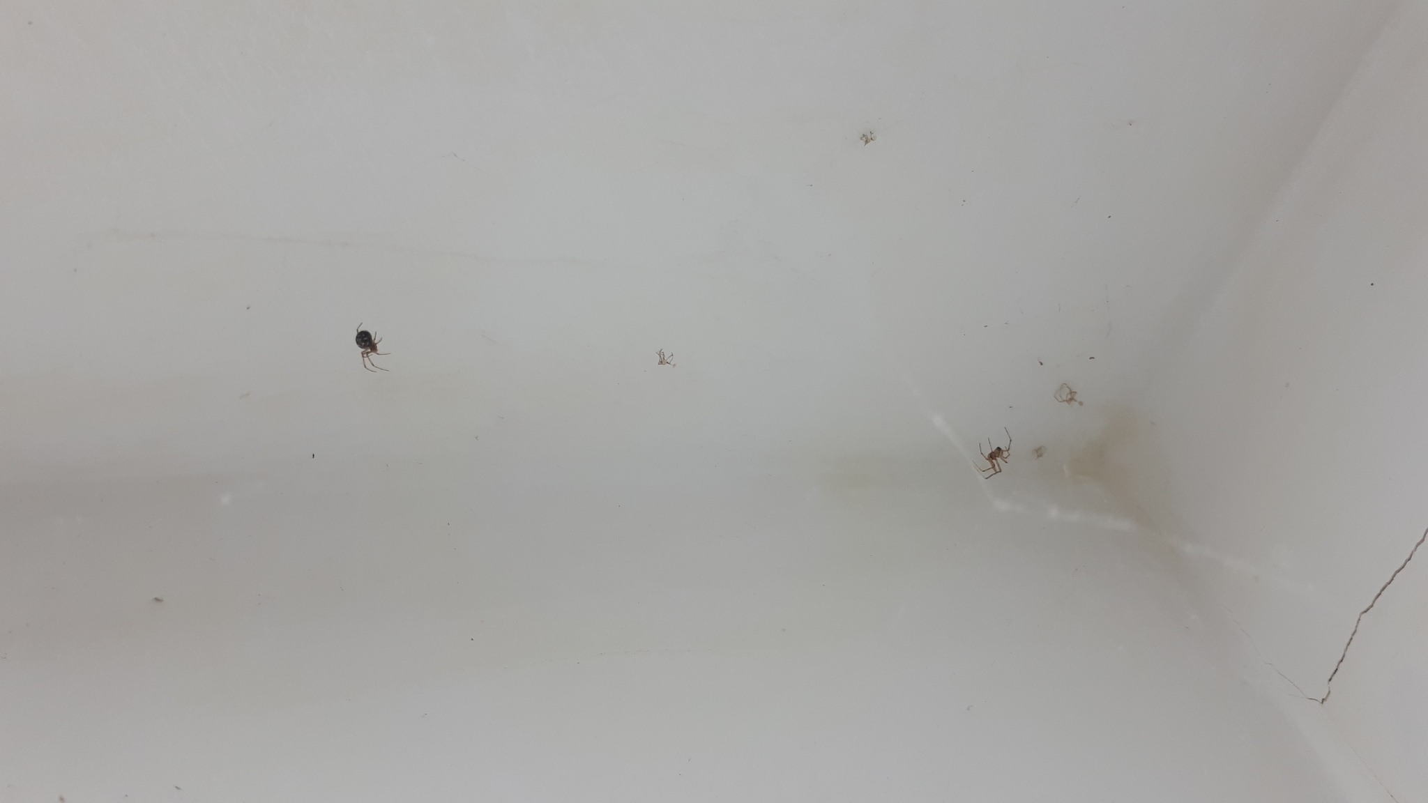У нас в общем туалете (общага) паук, называю её Матрешка. Тоже периодически подкармливаю. К ней периодически приходят "женихи" примерно на сутки, через несколько дней она вешает в углу шарик с яйцами, на фото снизу одно к тому времени уже вывелось все паучата расползлись, из второго вот только выводиться начали, третье повесила недавно. Я её не трогаю, помогаю, она всяких букашек ловит, НО! Есть несколько проблем. Беспорядок. Кругом обноски висят (старые шкурки). Объедки кидает на пол, туда же кекает (довольно обильно причем). Первое поколение паучат ушло в поисках нового жилья, но второе почему то решило остаться в том же туалете. Однажды спросони зашла намотала на лицо паутину, хотела умываться, смотрю - а они везде!! Вокруг полок, над мусорным ведром, за мусорным ведром, над унитазом, за унитазом, все углы... Теперь не знаю как с ними поступить. Выловить вообще всех и выселить? Или только мелких? Или вообще пофиг, пусть творят что хотят, а я посмотрю до чего это может докатиться (ахахах гарольдскрывающийболь.джипег)