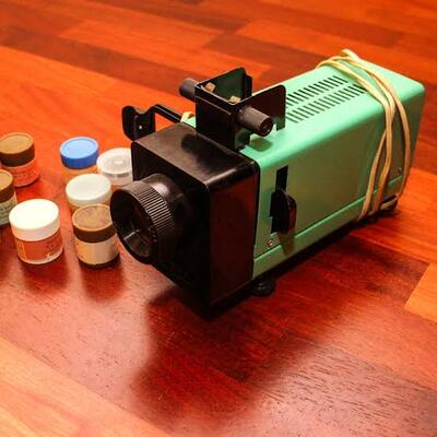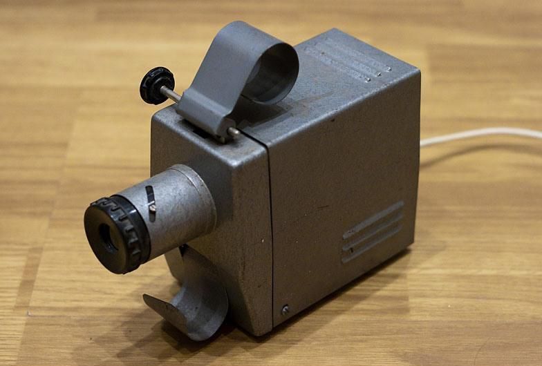Да!... Тоже такой был, только шнур в тряпичной оплётке, и барабан для плёнки - чёрный, эмалированый. Вот только аппарата уже давным-давно нет, но диафильмов 20-25 осталось.
