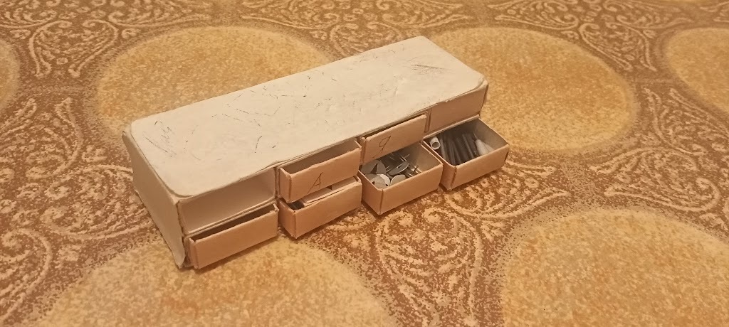 Ну а после высыхания внутри можно было хранить всякую мелочовку (иголки, булавки, скобки, скрепки, бритвочки, пуговицы, грифели, гвозди, шурупы, болты, шайбочки и так далее. На торце коробка можно было написать что-нибудь (что находится внутри) или прямо приклеить образец на клей/скотч.