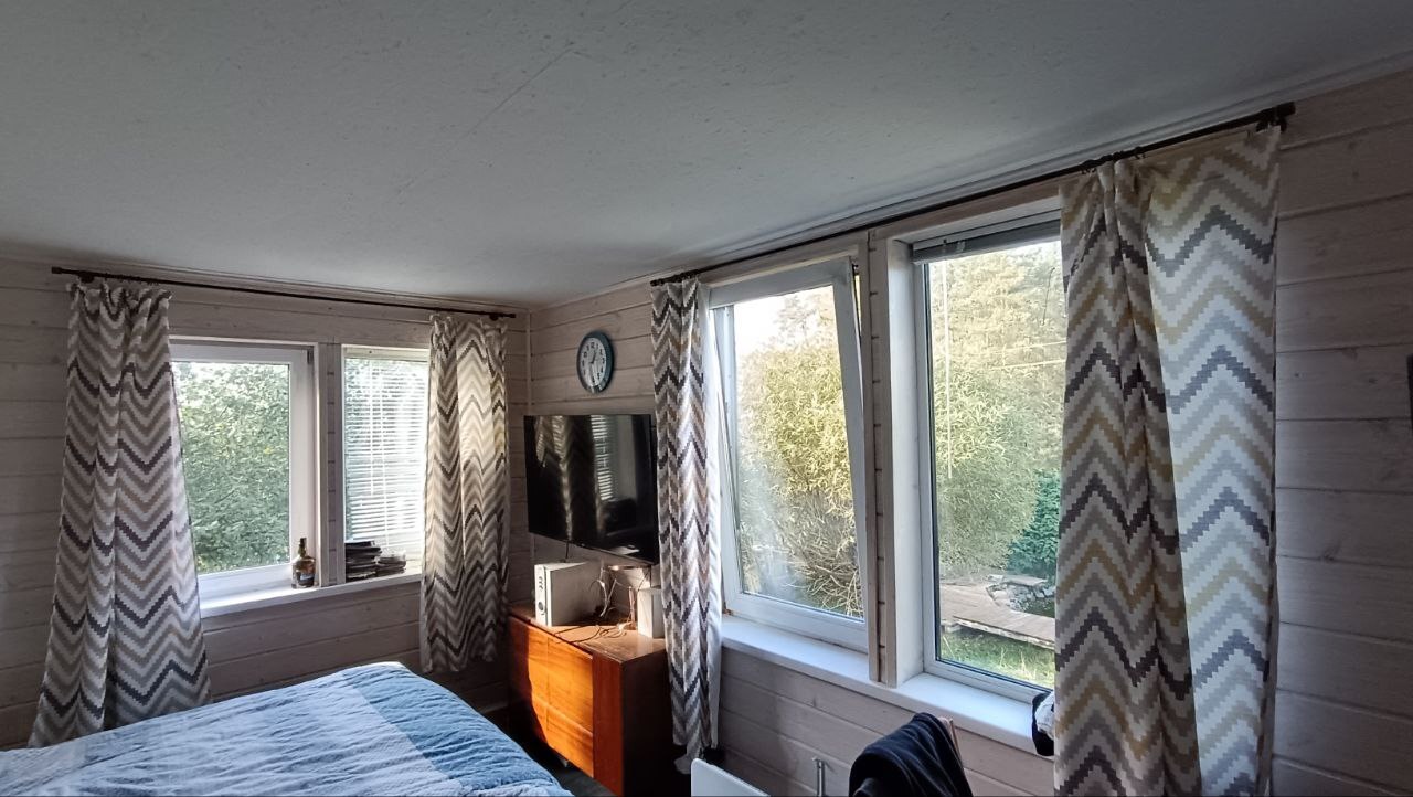 На отделке внутренних помещений тоже старались сэкономить. Имитация бруса сильно ударила по карману. Вся мебель кроме кровати б\у