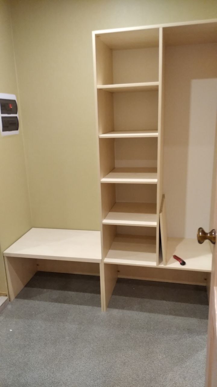 Со шкафами помогла подруга, сделала чертёж и по нему я заказал на мебельной фабрике распил ДСП и собрал мебель.