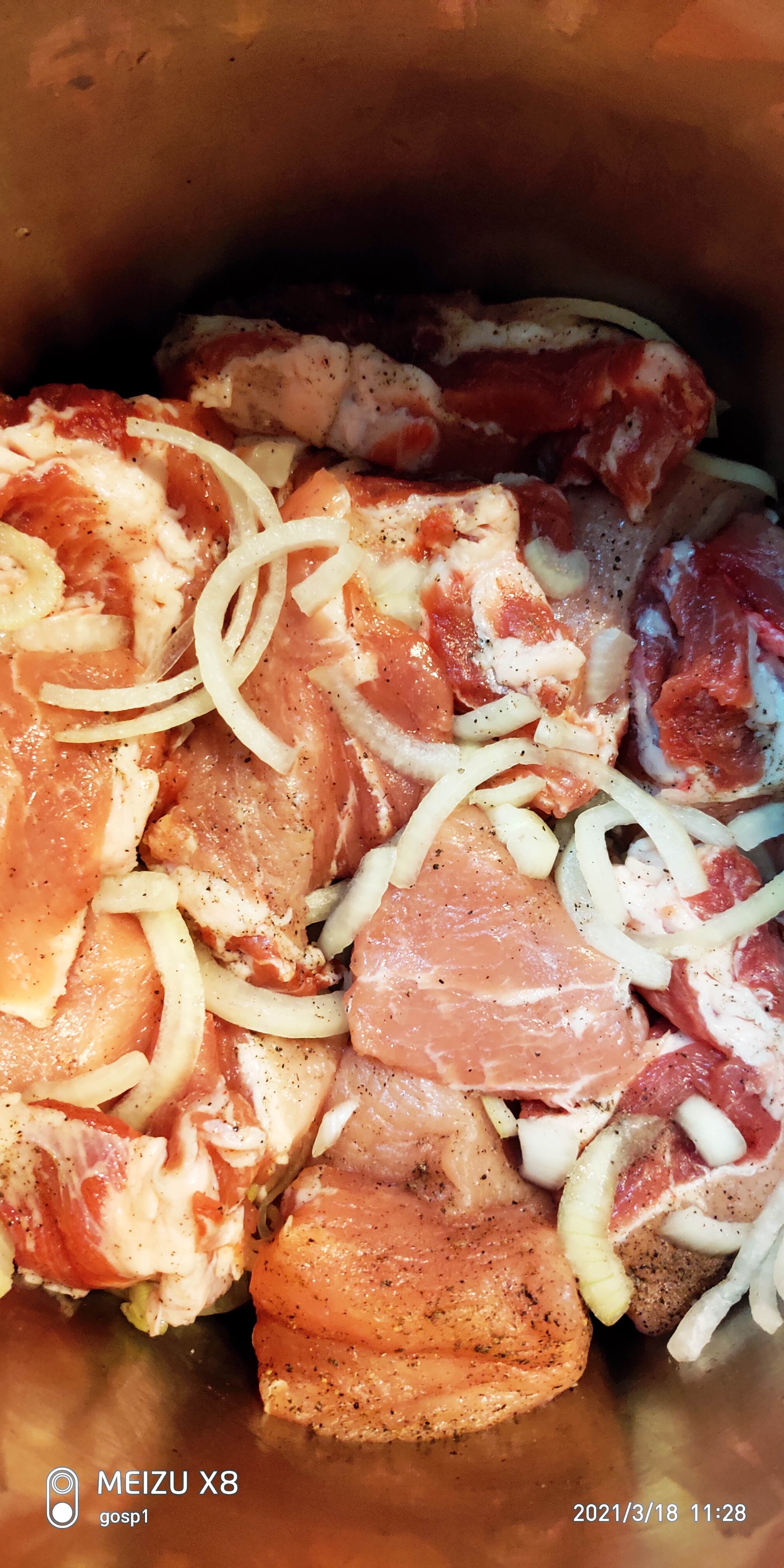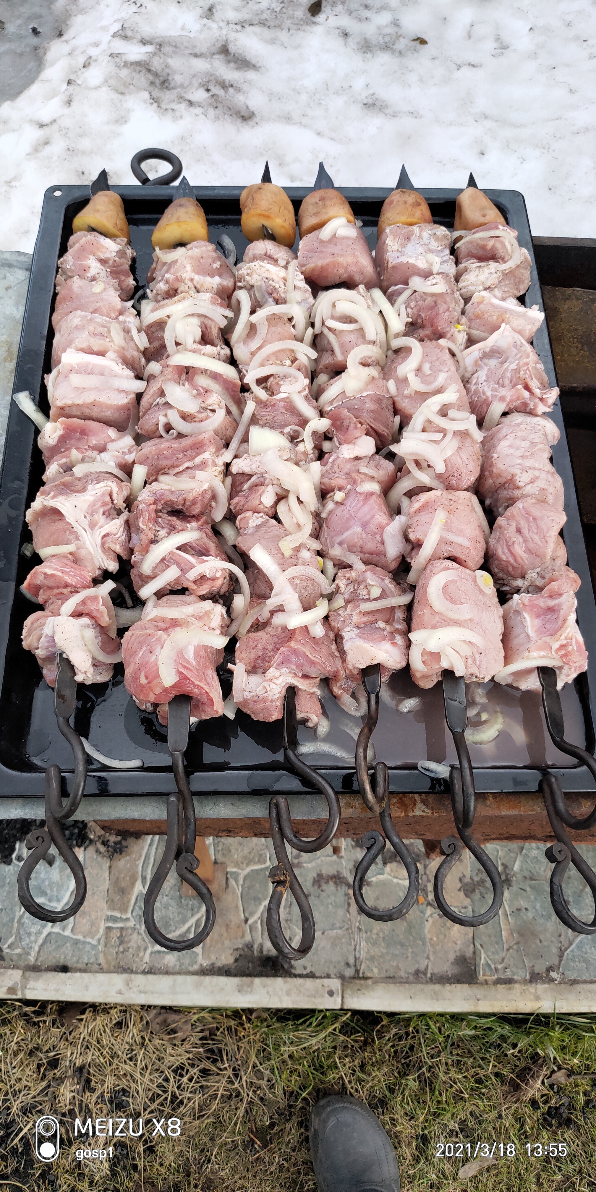 резать мясо надо немного крупнее чем на мангальный шашлык. маринад у меня простой, соль, смесь перцев, лук и сухое смородиновое вино собственного производства.