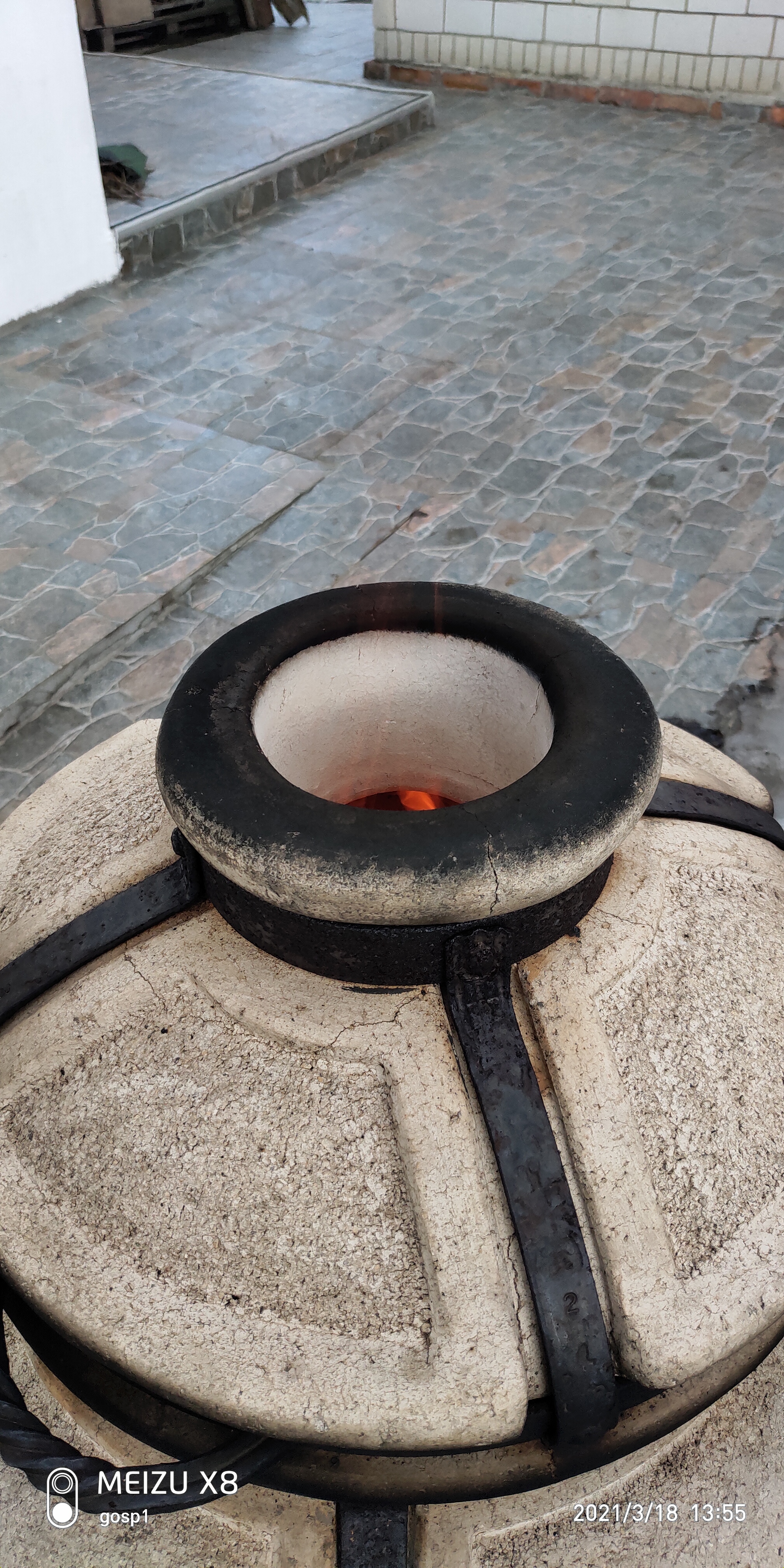 ура, горит! обратите внимание на черный дым, это сажа от прошлого раза. она является одним из показателей готовности тандыра к работе. вернее ее отсутствие. внутренние стенки должны стать девственно белыми.