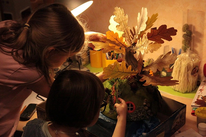У меня есть дочь. С тех пор, как она научилась держать в руке карандаш, постоянно что-то придумывает и делает. Ну и вот, нашла она в лесу корягу, от какой-то скрюченной сосны. Приволокла домой на всякий случай. А когда в школе задали изготовить осеннее дерево, немедленно приступила к изготовлению дерева из этой самой коряги. Но чтоб обязательно под деревом гном жил. В домике как у хоббитов. А все вокруг чтоб красиво было, как у Тотторо.