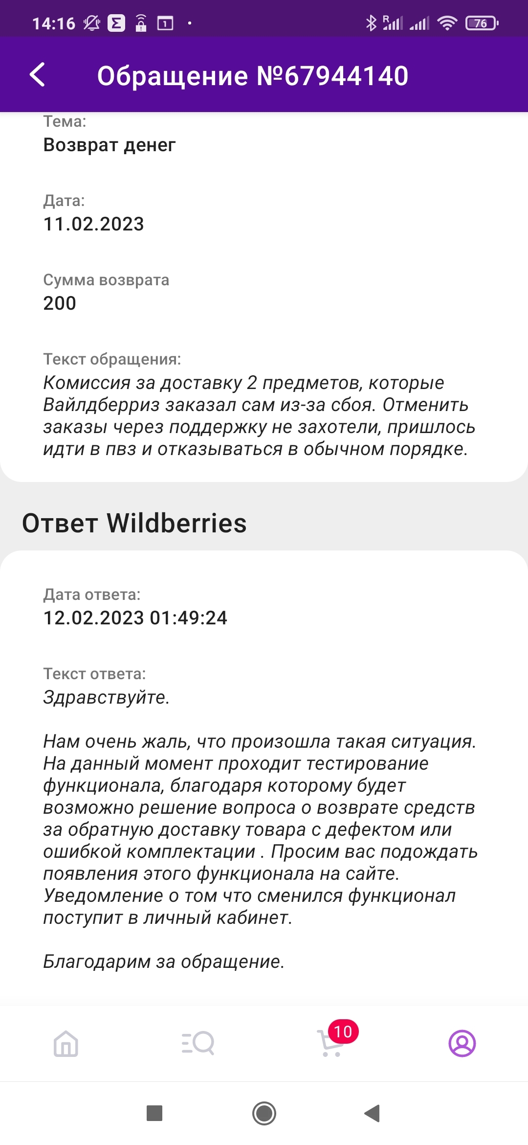 Больше желания писать письма в поддержку Вайлдберриз у меня не было. Я описала ситуацию в чатике Тинькофф и за пару часов мне сделали возврат моих 200р.