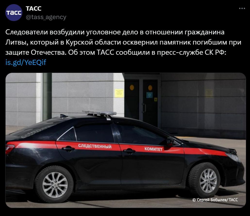 Следователи возбудили уголовное дело в отношении гражданина Литвы, который в Курской области осквернил памятник погибшим при защите Отечества. Об этом ТАСС сообщили в пресс-службе СК РФ.