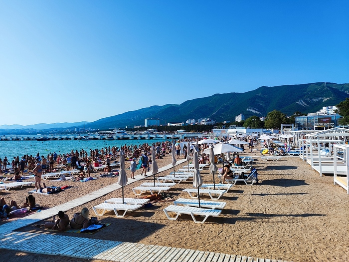 До моря 900 метров по улице торгашей, много всего. Берег - галька (в Геленджике - песок, но и тина есть).
