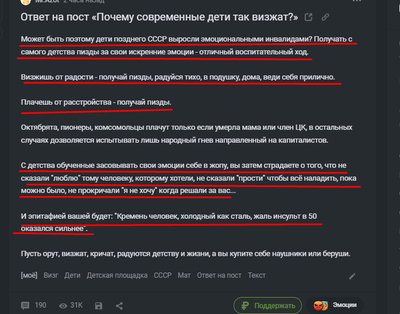 Может быть поэтому дети позднего СССР выросли эмоциональными инвалидами? Получать с самого детства пизды за свои искренние эмоции - отличный воспитательный ход.