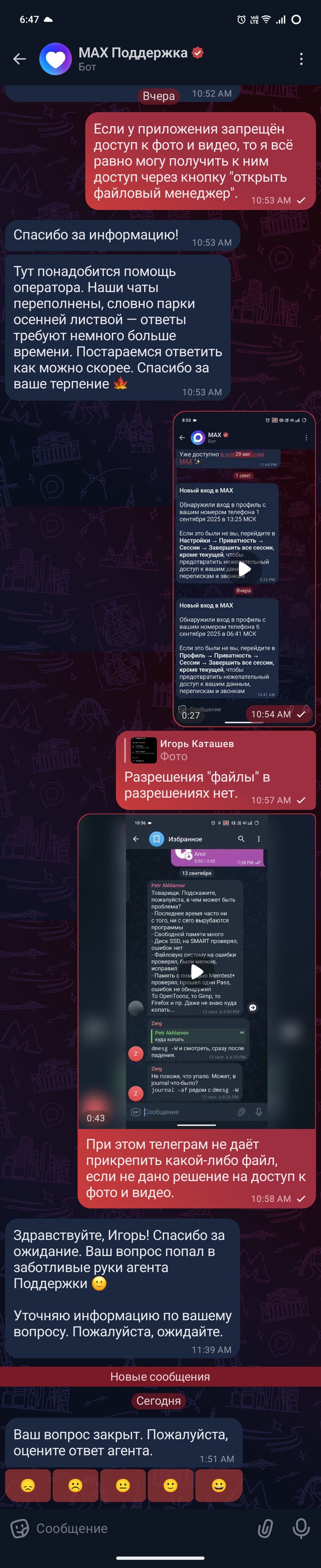 Я задал вопрос службе поддержки о доступе приложения к файловой системе, через 2 дня спросил о его продвижении и через час после ответа оператора мою заявку закрыли так и не ответив. Теперь я не могу преодолеть чат-бота поддержки, который не понимает сути вопросов, ответить не смог, а позвать оператора не даёт".