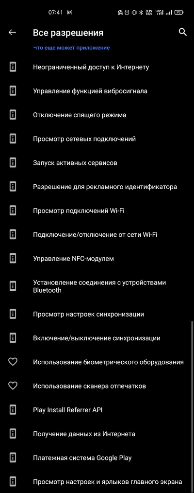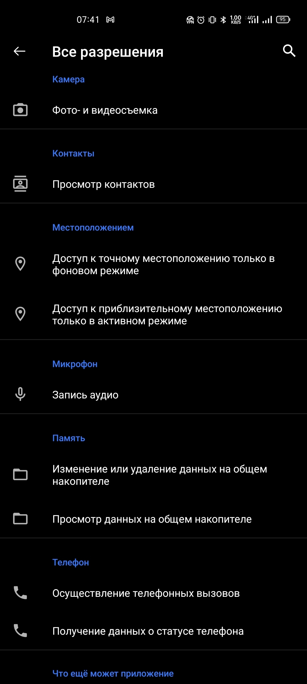 Для полноты картины разместите, пожалуйста, скрин всех разрешений этого приложения, чтоб поржать от души. Чтоб увидеть все разрешения на андроиде, нужно не просто зайти в настройки приложения "разрешения", а еще нажать на гамбургер" и выбрать показать все. Скринов, думается, будет несколько страниц.