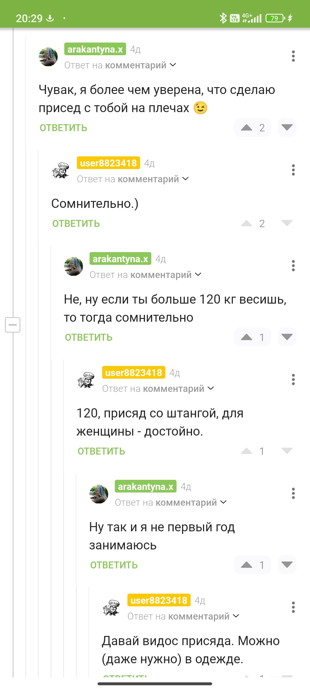 user8823418 Ответ на пост «Поиграешь со мной?)»1 5 месяцев назад Видос где присяда со штангой? Блокировала, но мы то помним что кто - то врал про 120 кг. Мы ждём.) [моё] Консоли Пицца Кигуруми Девушка с тату Пирсинг Ответ на пост Текст Длиннопост Ещё 0