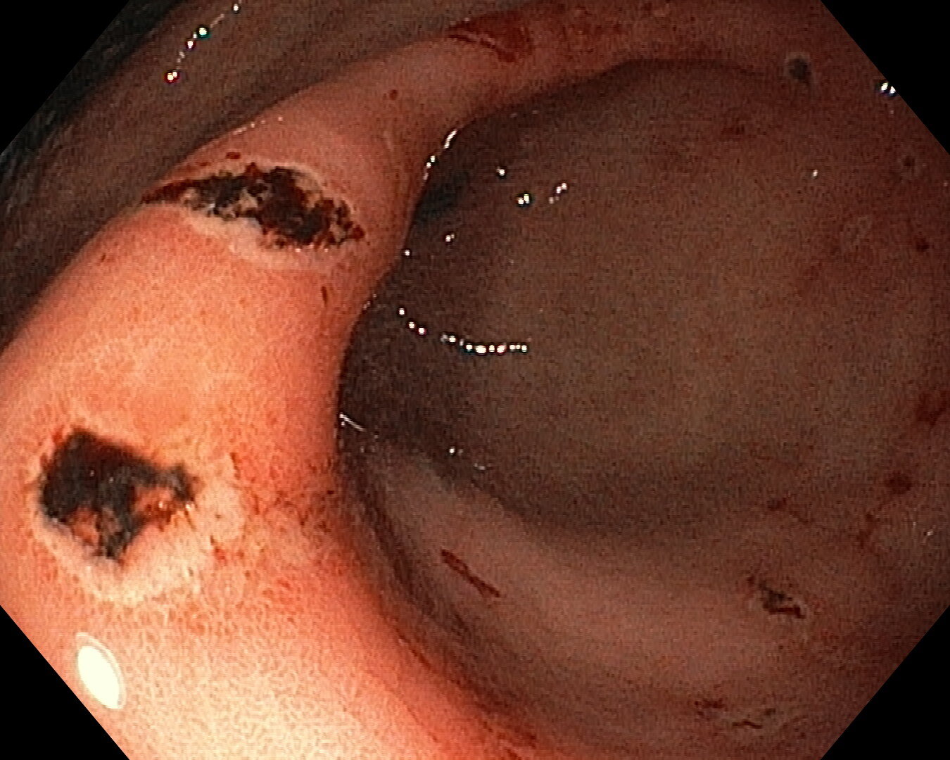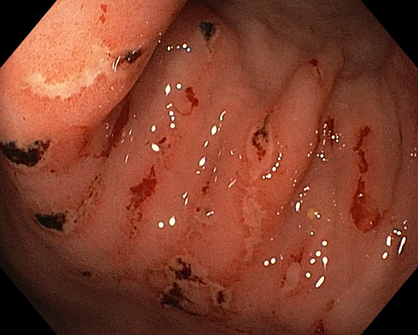 В качестве примера: на фото эндоскопическая картина химического ожога слизистой желудка, осложнившегося кровотечением. Пациентка была доставлена ко мне на гастроскопию после того, как отобедала с тарелкой, помытой азелитом. Тарелку плохо ополоскали после ПАВа. После недели лечения выписана домой в удовлетворительном состоянии, через месяц всё зажило.
