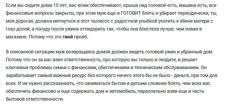 Если вы сидите дома 10 лет, вас всем обеспечивают, крыша над головой есть, машина есть, все финансовые вопросы закрыты, при этом муж еще и ГОТОВИТ блять и убирает периодически, ты, моя дорогая, должна метнуться и этот пылесос с радостной улыбкой укатить к ебени матери с глаз долой, а посуду после ужина отпидорить так, чтобы она блестела лучше, чем новая в магазине. Потому что это твой проеб.