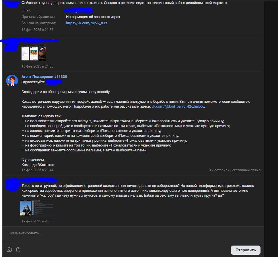 Мне вот больше интересно, почему ВКонтакте, максимально игнорирует подставные группы аля "малого бизнеса" которые созданы с одной целью - рекламировать казино в клипах. Кидал репорты, писал в поддержку, им по=ху=ю. Группа из ряда "Строительные материалы" а в купленной рекламе клип с рулеточкой и тем как он выводит 100500 денег на карту. У них даже сайты подставные есть. И групп таких тысячи, ни один мой репорт не повлиял ни на что. Гребут деньги с рекламы и похуй на законы.