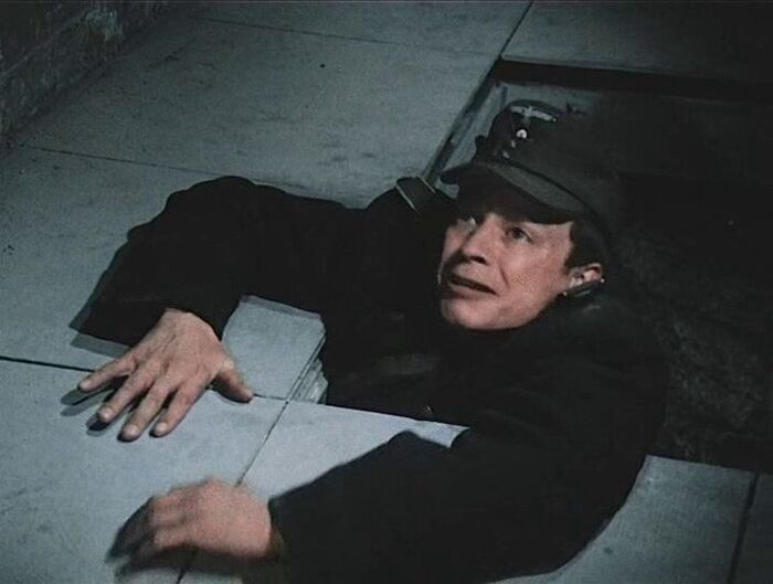 У фашиста в кабинете люк, сбрасывающий людей в шахту, по нажатию кнопки. Выживший рассказывает про это.