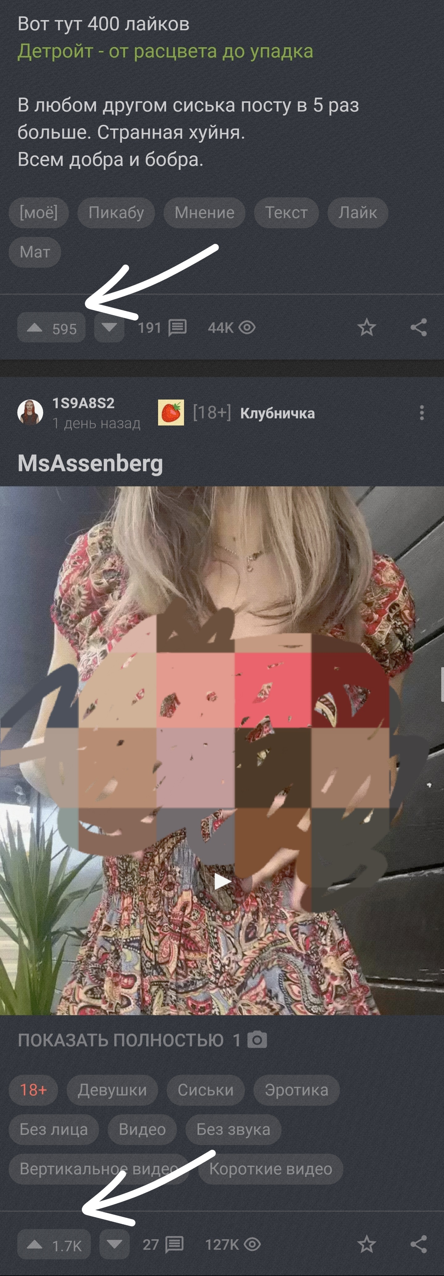 Да, кстати, интересное совпадение: подтверждение слов ТС про дисбаланс плюсов у авторского контента и 18+ прямо у меня в ленте, как на заказ