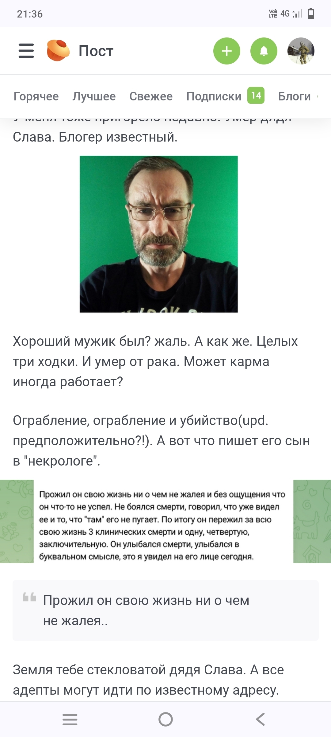 У меня тоже пригорело недавно. Умер дядя Слава. Блогер известный.