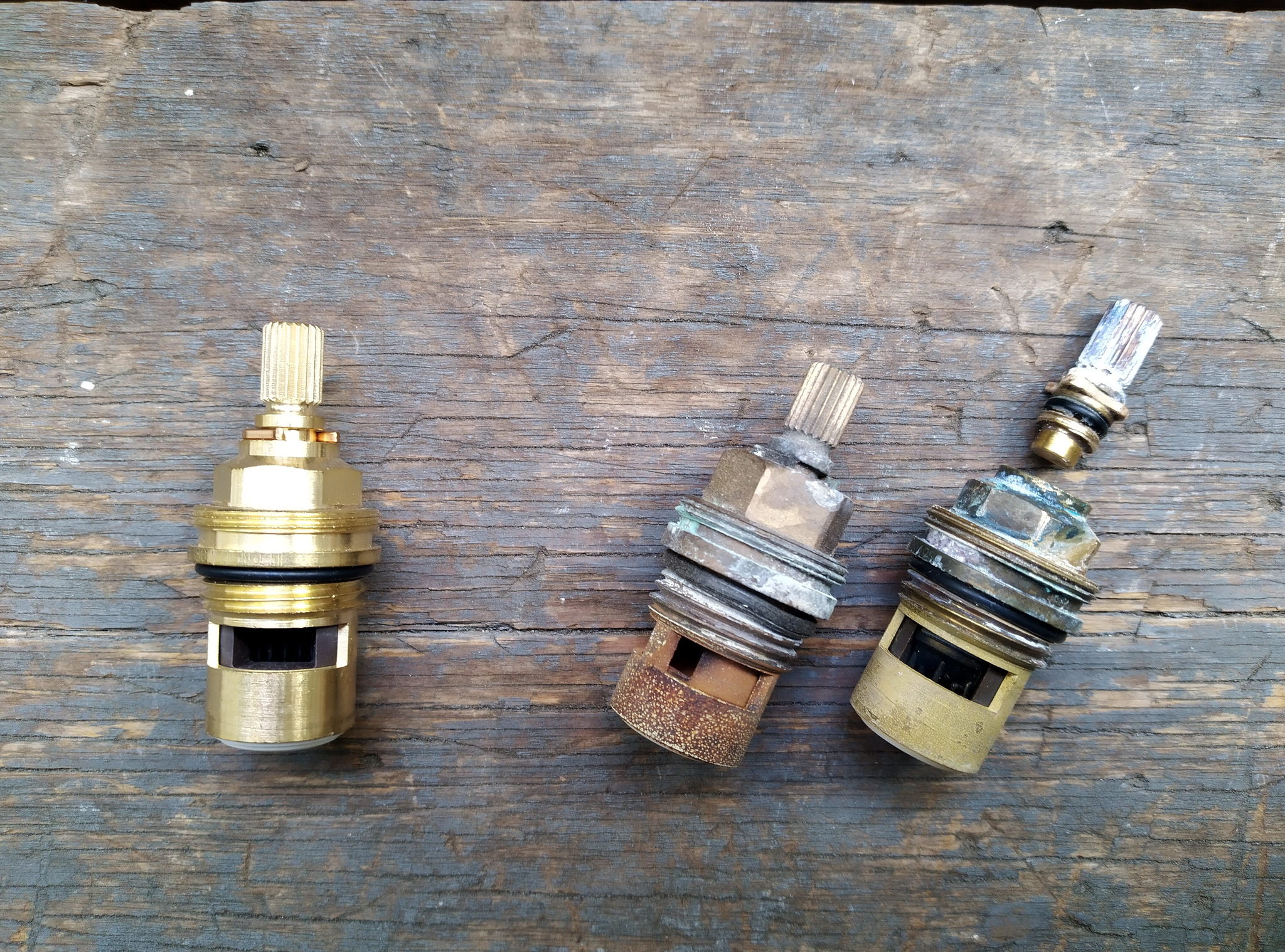 2. Кран-буксы Vidima, слева новая, справа потекшие после нескольких лет эксплуатации. Одна сломана, потому что прикипела к смесителю, и пришлось срывать с помощью рычага, вот таким образом.